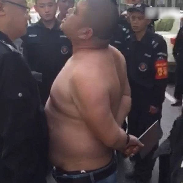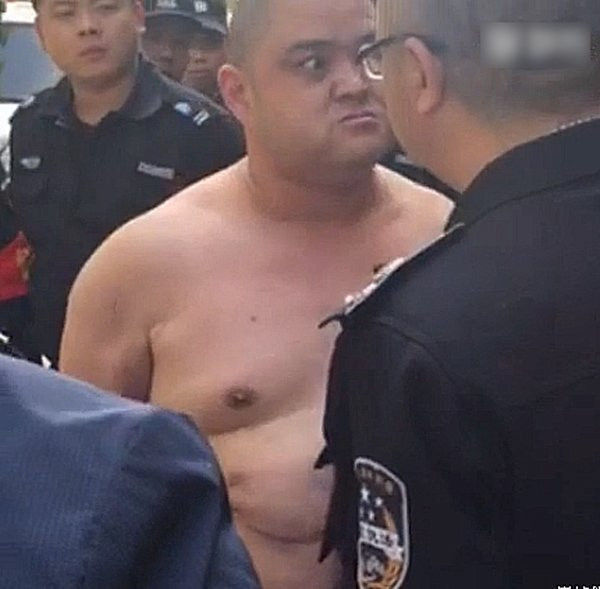 4月19日上午9时许,王国强的中队与淮河路办事处的工作人员一起,上街清理辖区内占道经营的摊贩。清理到汉江路与嵩山路交叉口东北角一家胡辣汤店时,发现该店在门前的人行道上,摆了一些桌凳和灯箱。执法人员上前清理占道物品时,一名光头、体型较胖的男子掂着一把菜刀,从店里冲了出来,对着执法人员大声叫骂。他上前制止,被对方指着鼻子辱骂和威胁。图为男子持刀脱衣。