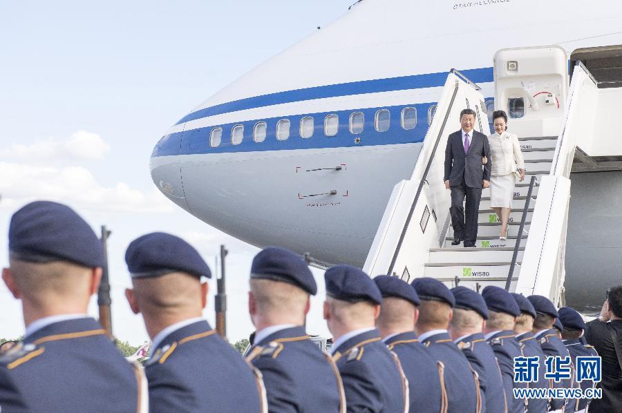 当习近平乘坐的专机进入德国领空时,2架德国空军战机升空护航。当地时间晚上6时30分许,专机抵达柏林泰格尔机场。习近平和夫人彭丽媛步出舱门。现场鸣21响礼炮,战机在空中飞越致意。德国政府高级官员在舷梯旁迎接。礼兵分列红地毯两侧。